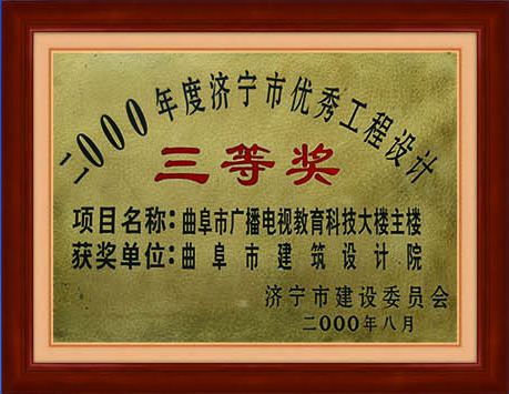 零零年曲阜市廣播電視教育科技大樓主樓濟(jì)寧市優(yōu)秀工程設(shè)計(jì)三等獎(jiǎng)